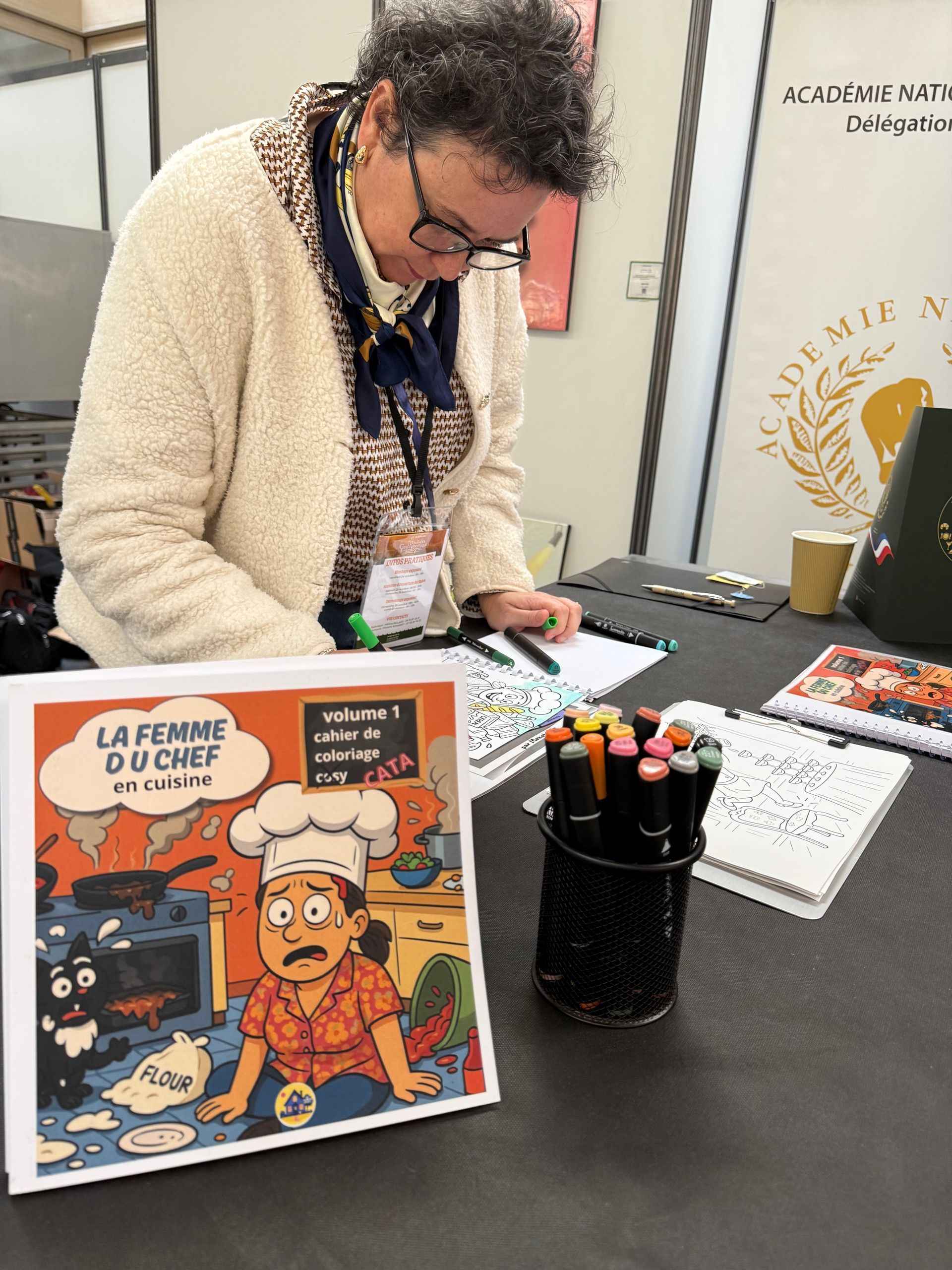 Sur le stand, un espace était réservé à « La femme du Chef » qui présentait son cahier de coloriage (des gaffes, des plats ratés, des scènes absurdes en cuisine… à personnaliser. Le tout saupoudré d’autodérision et de bonne humeur) et animait un atelier pour les enfants.